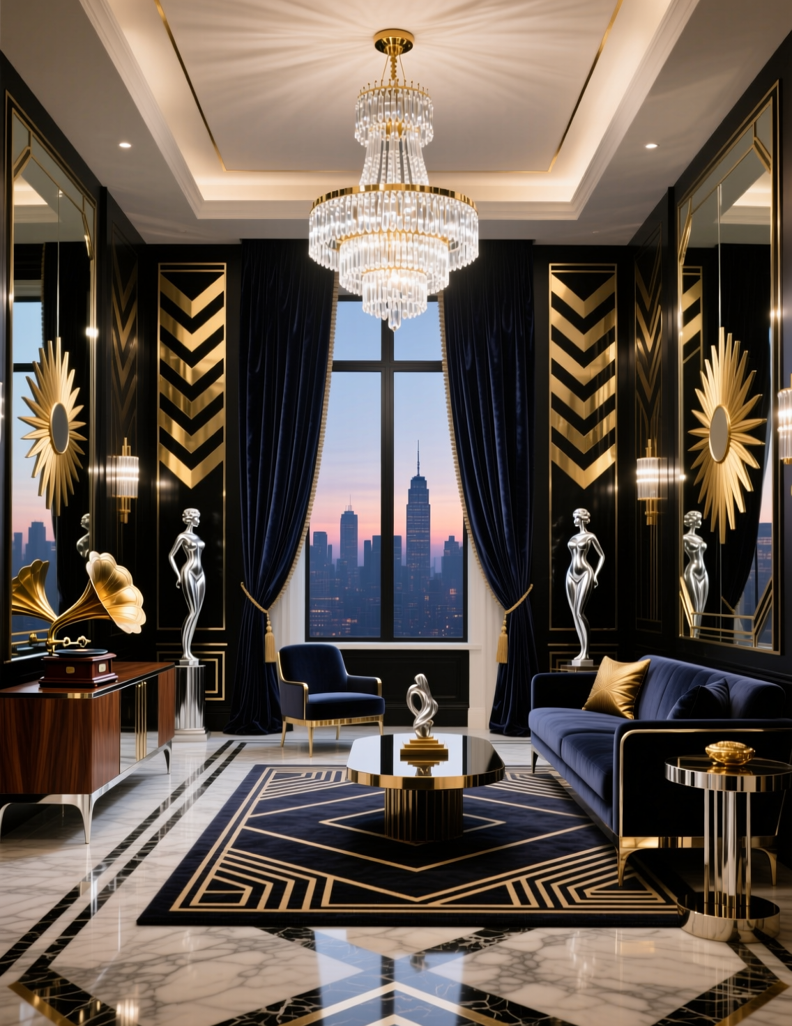 Пример: гостиная с серыми стенами (матовая венецианская штукатурка), диваном в бархате цвета старого вина, журнальным столом из чёрного мрамора и бронзовых труб, парой кресел в изумрудной обивке — и всё. Никакого золота на стенах. Только в деталях: ножки мебели, рамка зеркала, подсветка карниза.